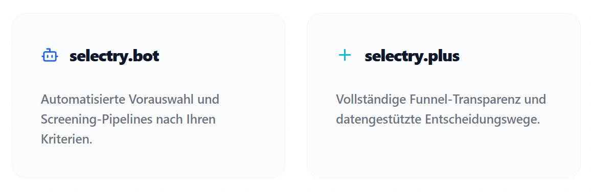 Selectry ist ein neues Produkt für planbares Recruiting. Wir kombinieren Automatisierung mit echter Recruiting‑Expertise, damit Hiring Teams schneller zu einer belastbaren Kandidaten‑Auswahl kommen – ohne die Kontrolle abzugeben.